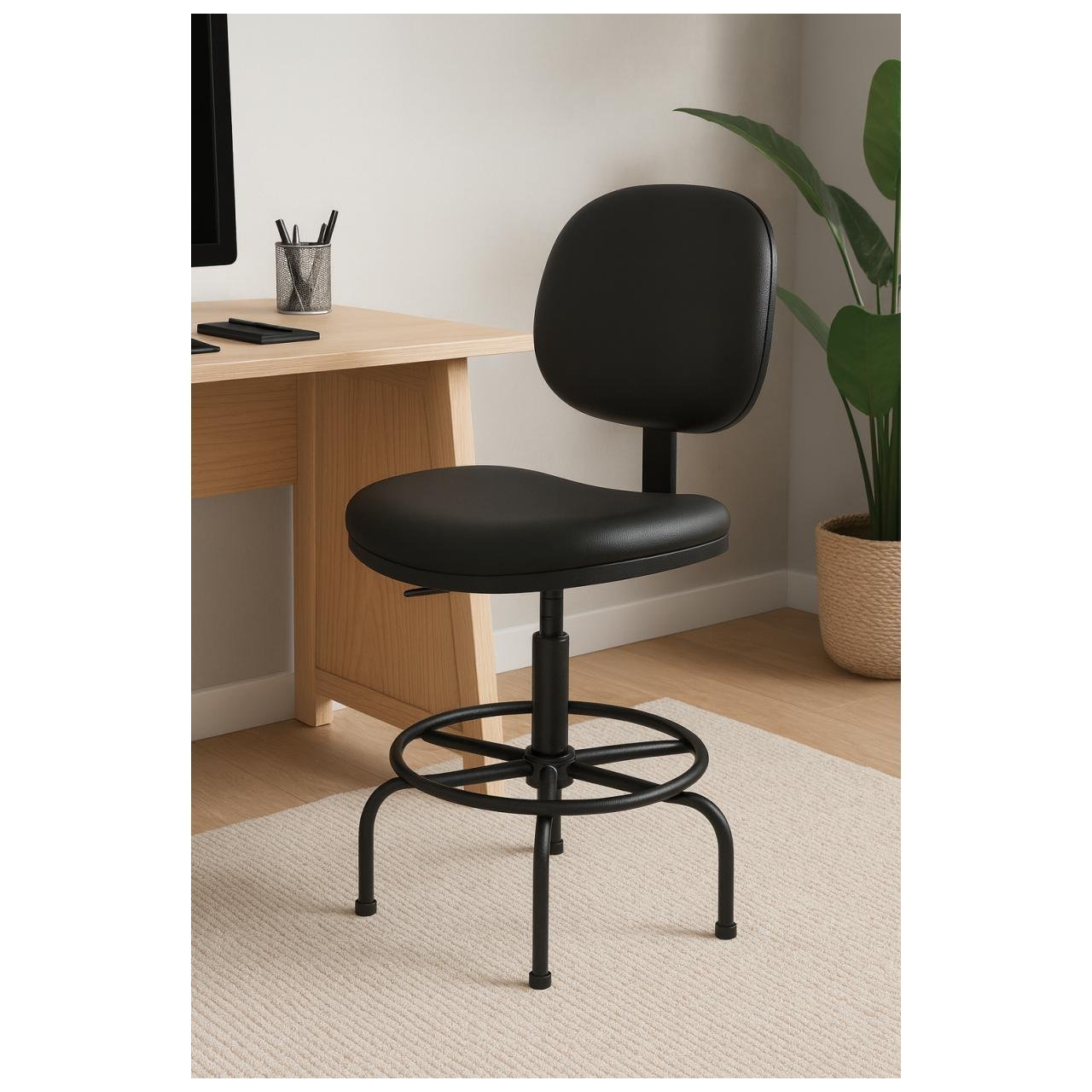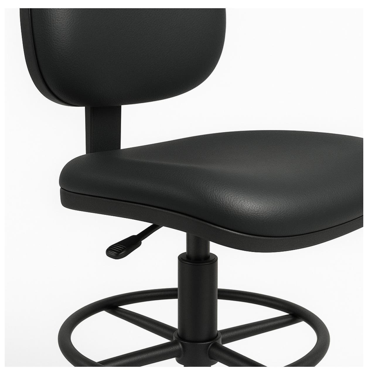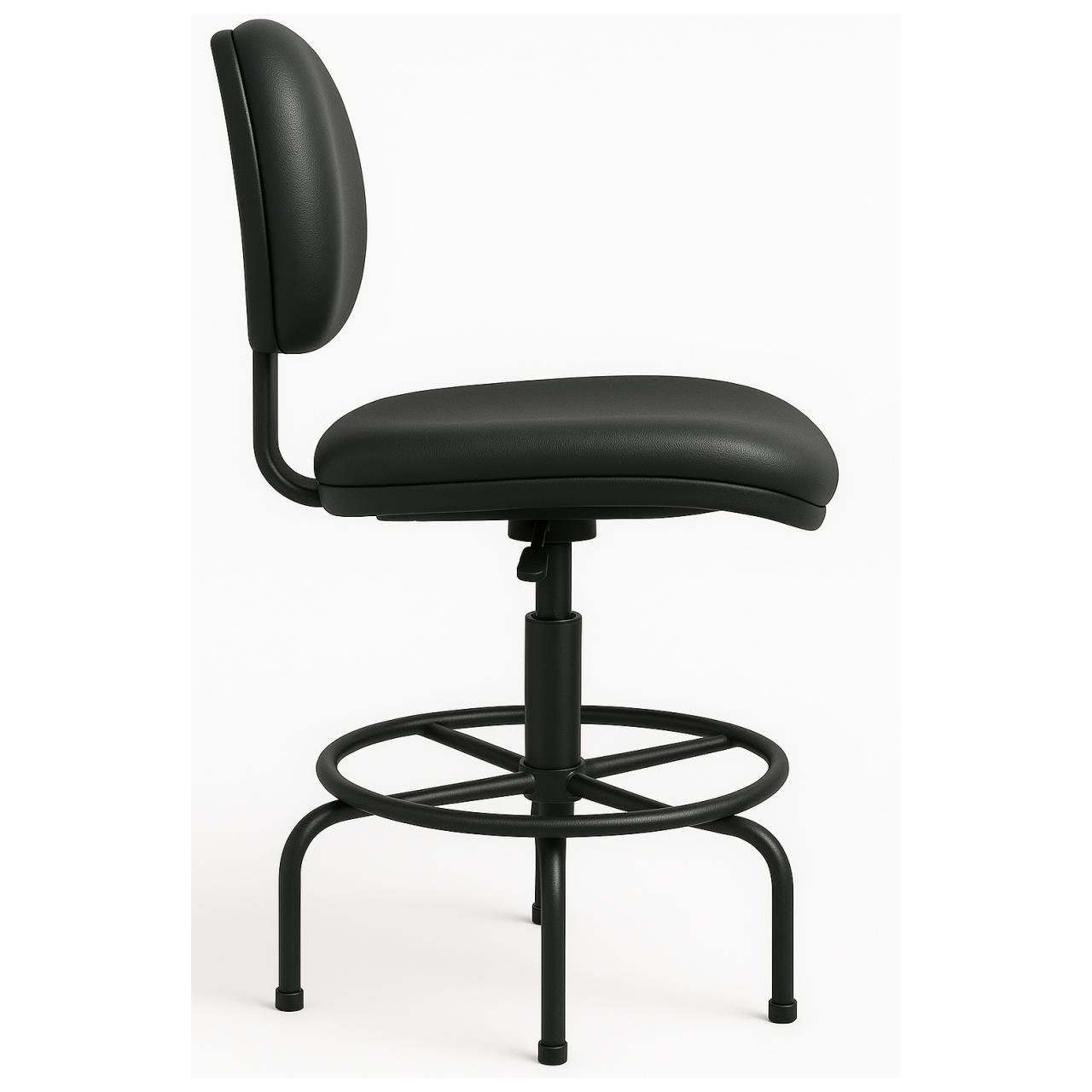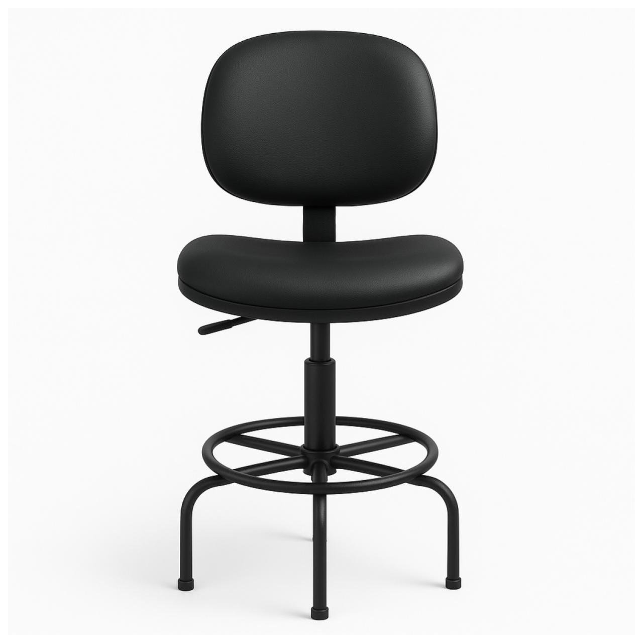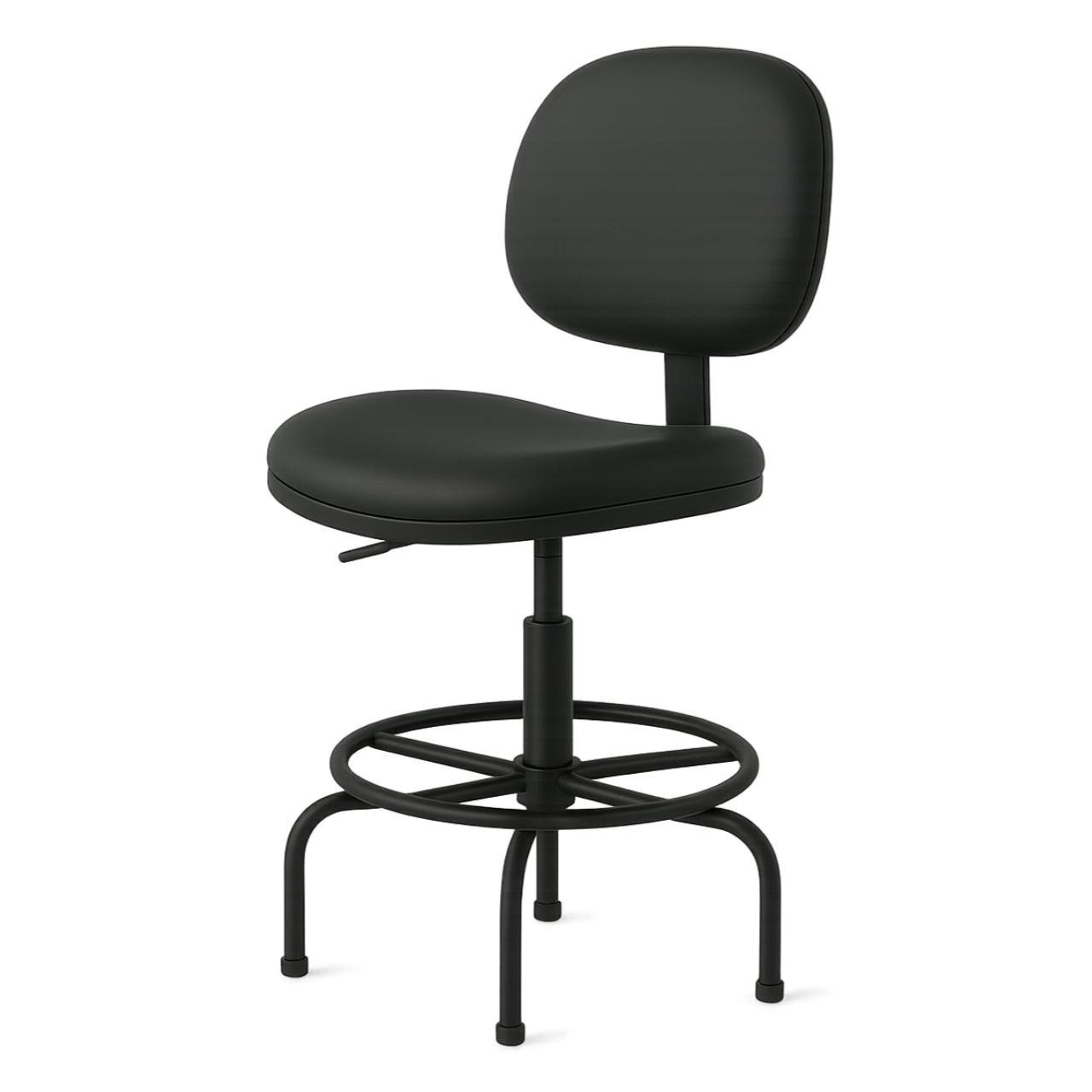 Base em aço reforçado com aro circular para apoio dos pés, garantindo maior conforto em uso prolongado.