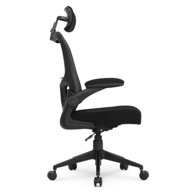 - Apoios de braços com regulagem de altura e inclinação, rebatíveis para cima (ótimo para quem precisa otimizar espaço quando não está usando a cadeira).