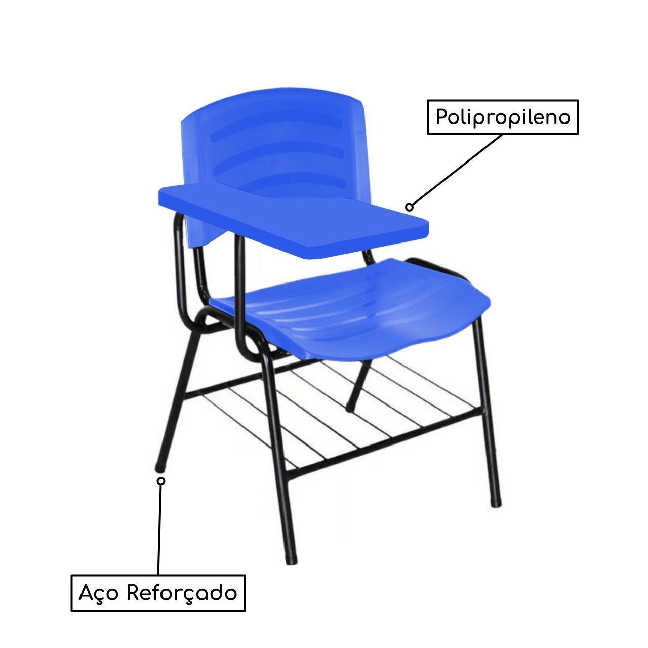 Mais informações: Prancheta em Polipropileno, Assento e encosto em polipropileno, Base de aço com pintura eletrostática (montável), Porta Livros.