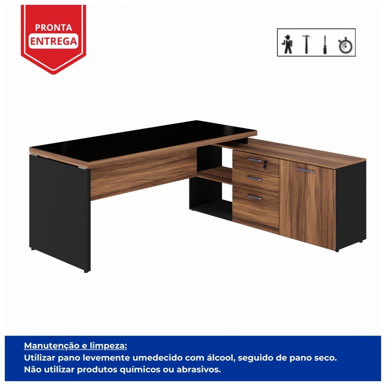 Mesa Diretorzinha c/ vidro c/ Aparador – Pé de MADEIRA – 1,90×1,50m – PMD – NOGAL SEVILHA / PRETO – 21428