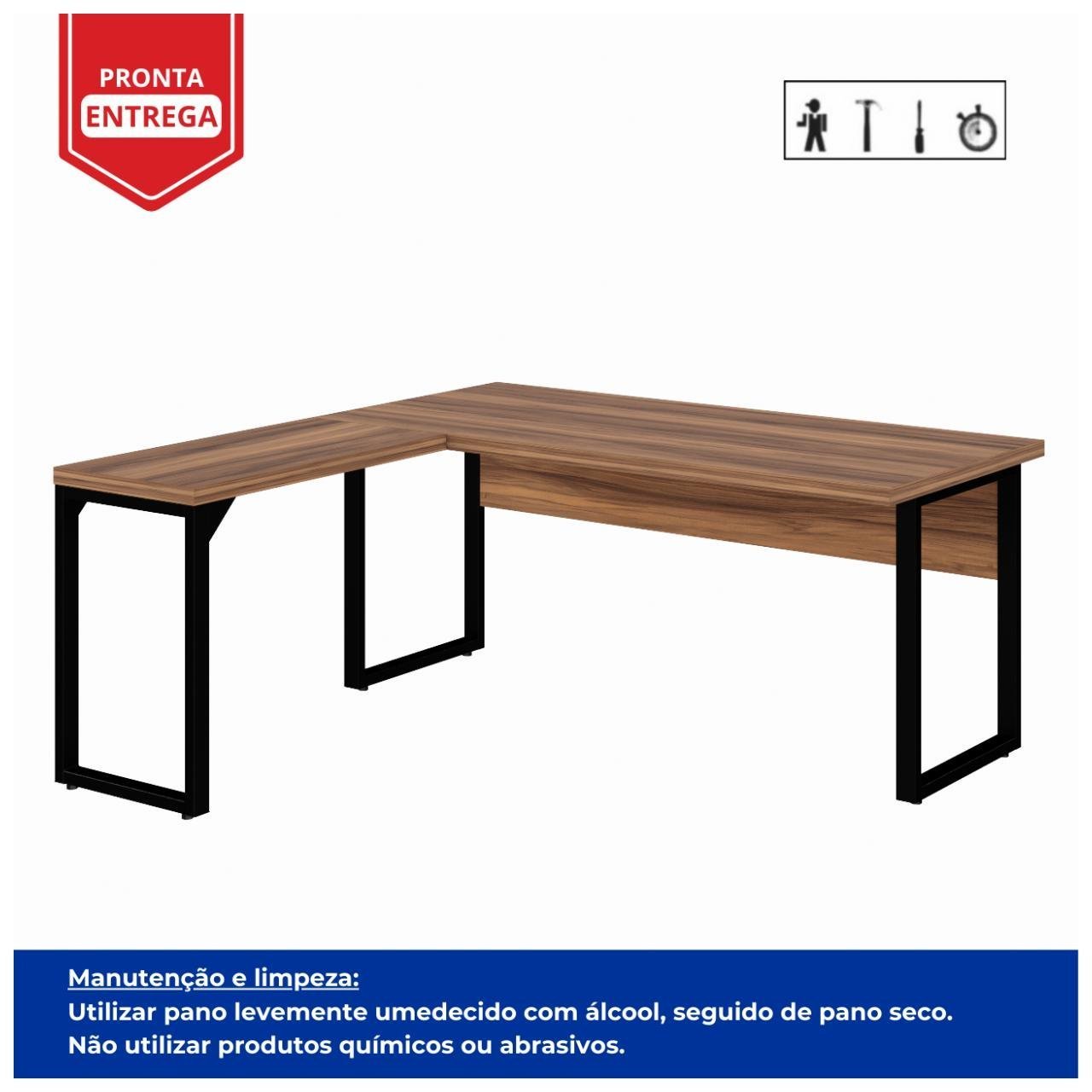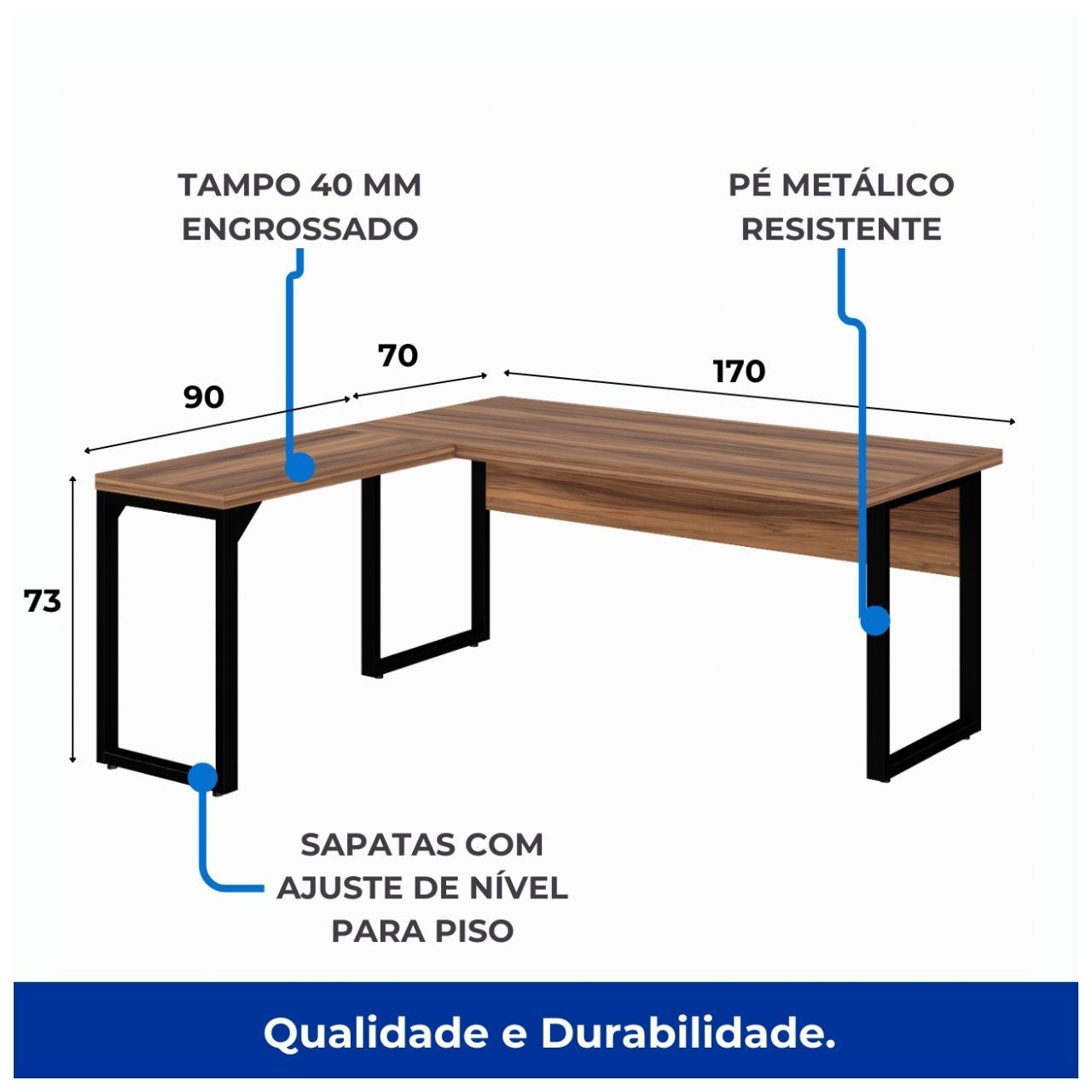 Produto: Mesa em L PÉ QUADRO (Mesa 1,70m + Mesa Auxiliar) – S/ Gavetas NOGAL SEVILHA/PRETO – 24478