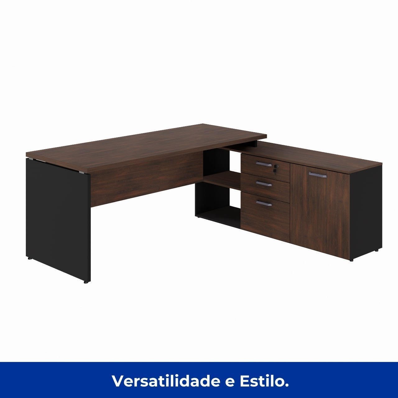 Mesa em “L” robusta, ideal para escritórios executivos, com design imponente, acabamento sofisticado em padrão amadeirado Marsala e estrutura em preto. Acompanha aparador lateral multifuncional com gavetas, armário e nichos abertos, oferecendo excelente espaço para organização.