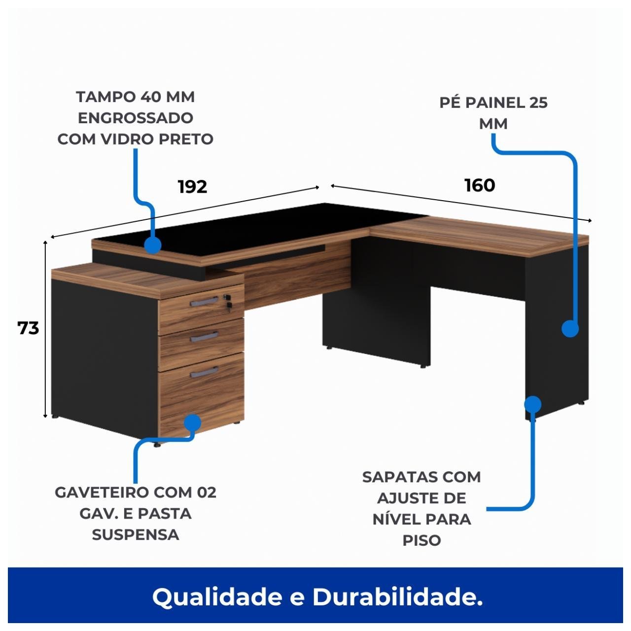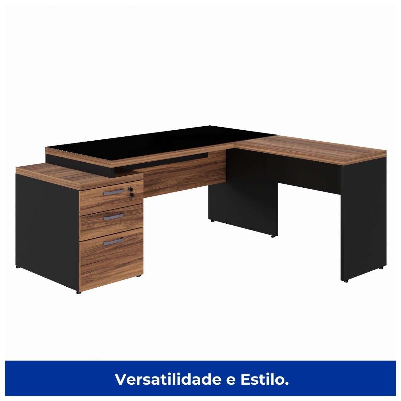Mesa para Escritório em “L” com VIDRO FUMÊ – 1,92X1,60M NOGAL SEVILHA/PRETO – 21407